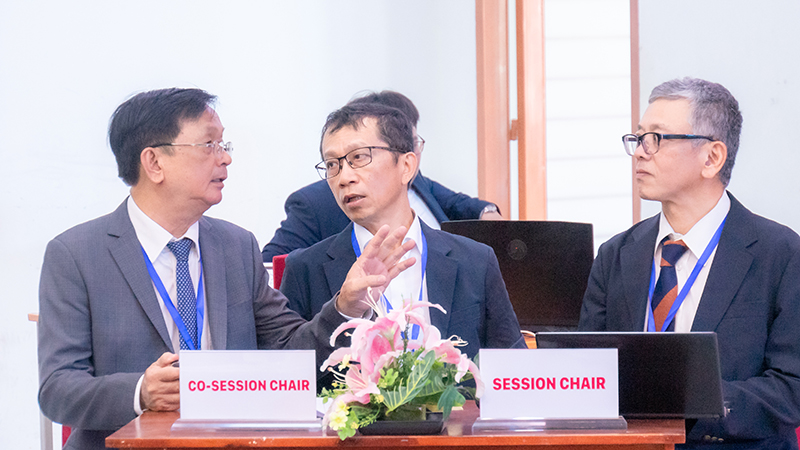 Chủ trì phiên Báo cáo tổng thể: GS,TS. Nguyễn Huy Bích – Nguyên Trưởng khoa Khoa Cơ khí Công nghệ, Trường Đại học Nông Lâm thành phố Hồ Chí Minh Đồng Trưởng Ban tổ chức, GS. Ju -Yi Lee – Trưởng Khoa Cơ khí, Trường Đại học Quốc lập Trung ương Đài Loan, GS. Keiji Yamada – Trường Đại học Hiroshima, Nhật Bản (từ trái sang)
