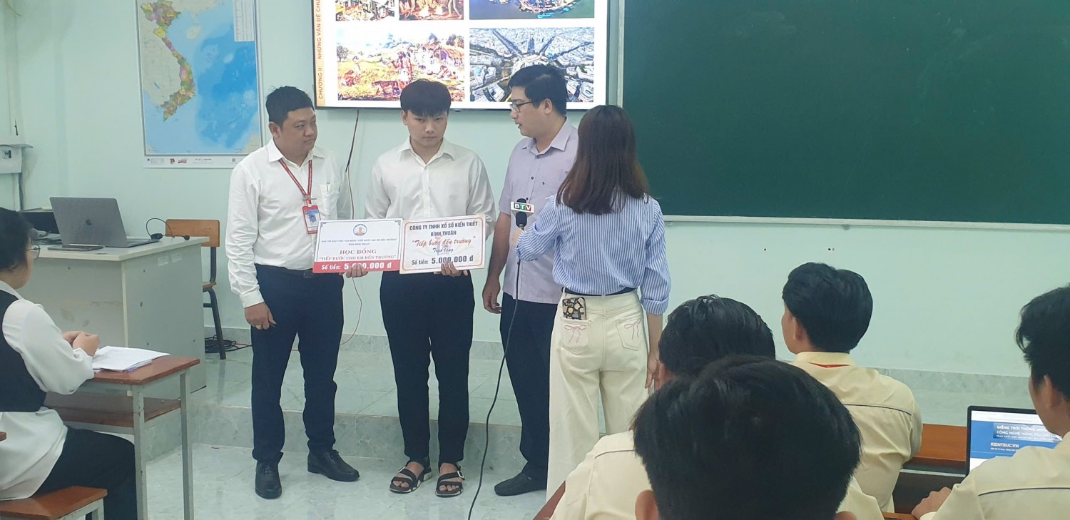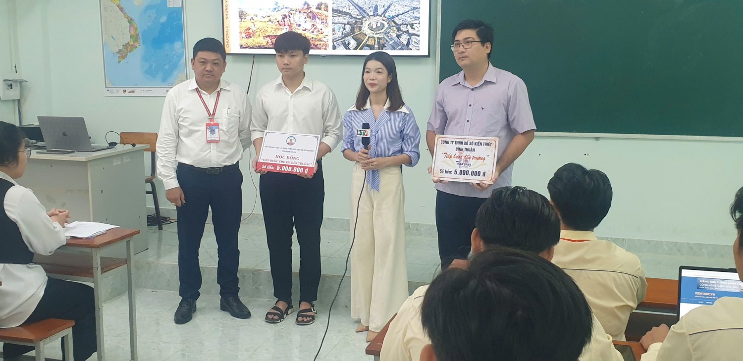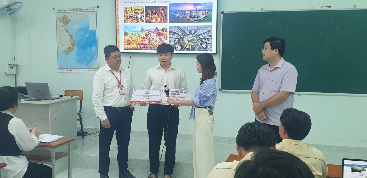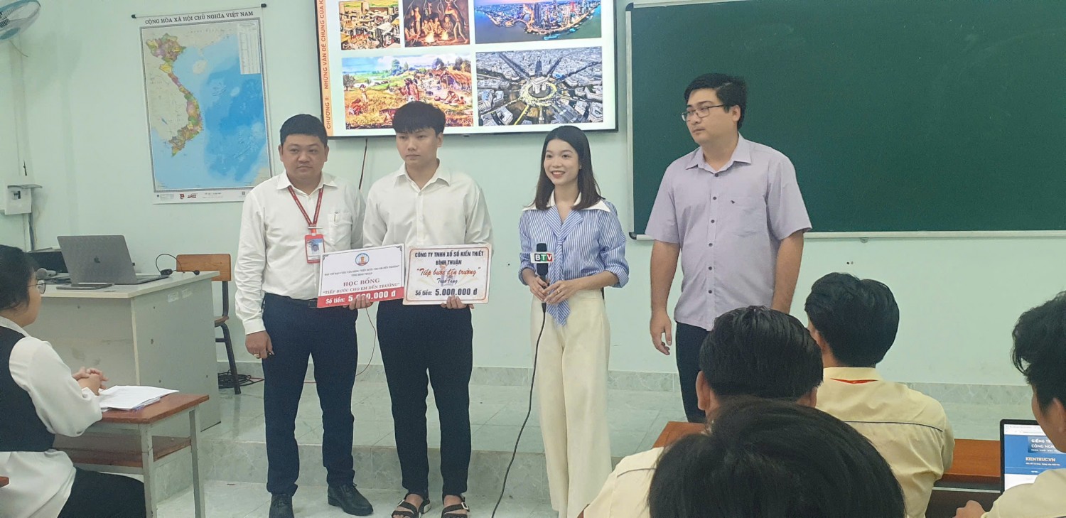 Nhằm tiếp sức cho sinh viên vượt qua khó khăn, vững bước trên con đường học tập và phát triển bản thân, ngày 05/05/2025, Đài phát thanh truyền hình Bình Thuận và Công ty xổ số kiến thiết Bình Thuận đã tổ chức lễ trao học bổng “Tiếp Bước Đến Trường” cho em Nguyễn Phi Long sinh viên Khoa Kỹ Thuật Công Nghệ có hoàn cảnh khó khăn, có tinh thần vươn lên trong học tập và rèn luyện.